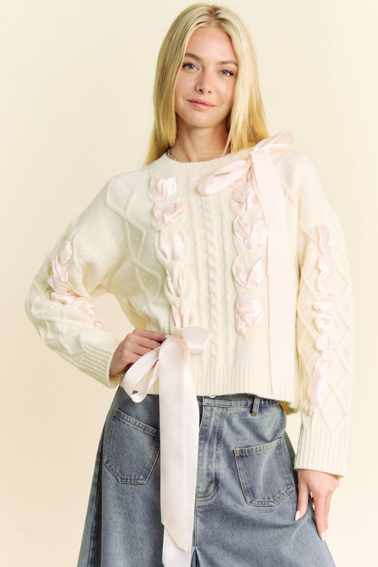 CHUNKY CABLE RIBBON TAPE LACE UP PULLOVER SWEATER